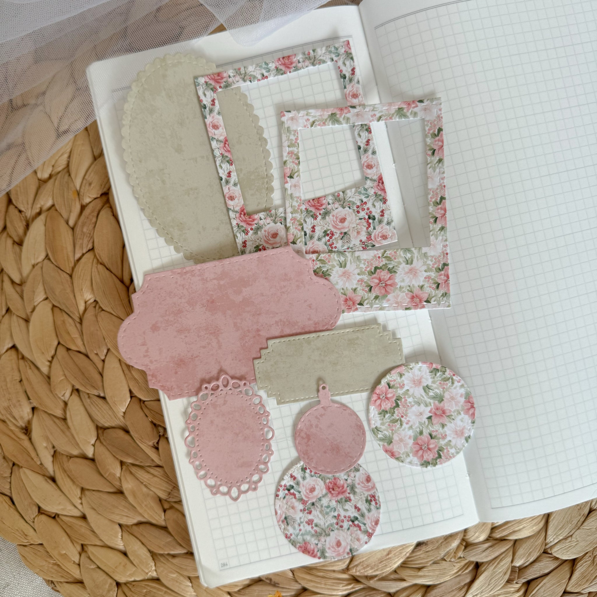 the paper items are cut out of linen card stock paper and smooth 120gm2 paper. The stickers are printed on matte sticker paper and then die cut.