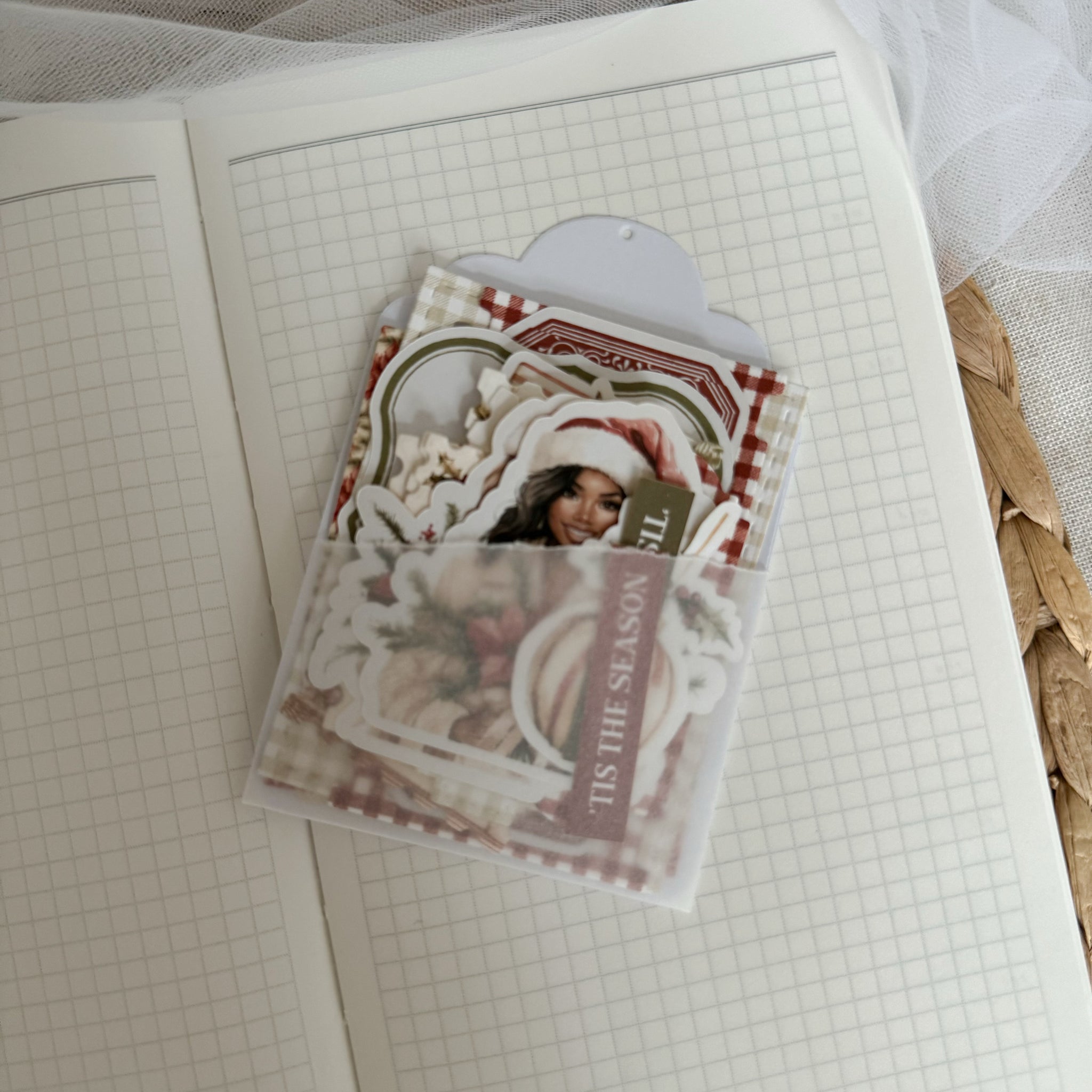 the paper items are cut out of linen card stock paper. The stickers are printed on matte sticker paper and then die cut.